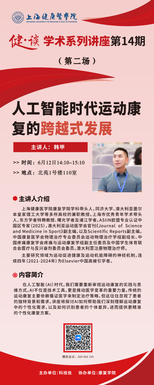 第二场将于2025年6月12日14:10在北苑1号楼110室举办,特邀上海健康医学院康复学院学科带头人韩甲教授,作主题为“人工智能时代运动康复的跨越式发展”的报告。