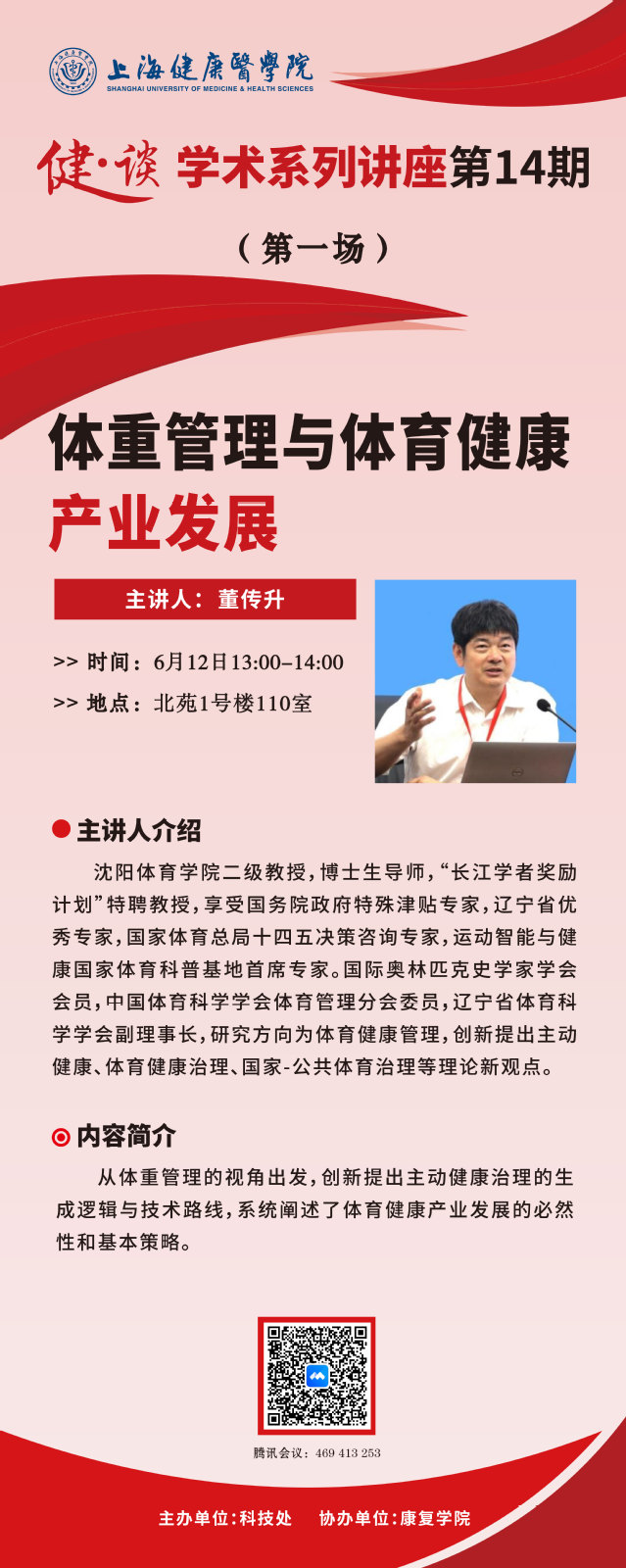 第一场将于2025年6月12日13:00在北苑1号楼110室举办,本期特邀沈阳体育学院二级教授,博士生导师董传升教授,作主题为“体重管理与体育健康产业发展”的报告。