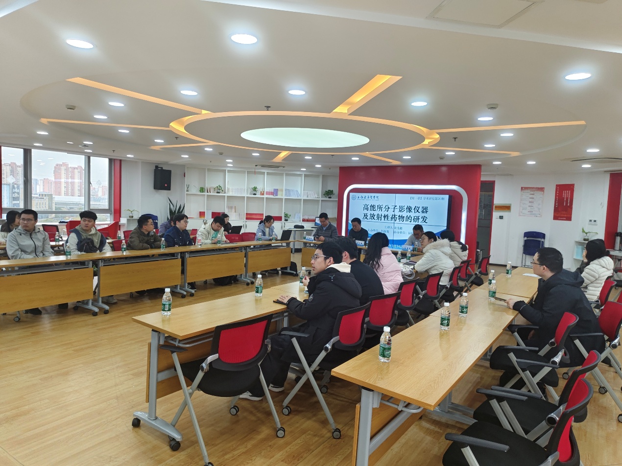 讲座中,黄先超研究员从分子影像仪器自主研发、放射性核素自主量产及药物开发、多模式动物脑影像数据分析三个核心维度展开,介绍了高能所在分子影像领域的平台建设与技术创新,全景展示从核素生产、探针研发到仪器研制、数据分析的全链条科研成果,并分享了全景动物PET-CT、44Sc诊疗一体化核素等代表性案例,为在场师生开展分子影像与放射性药物相关研究提供了重要思路与实践参考。